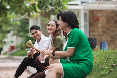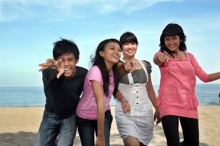 Group portrait of happy young Asian people sitting on the floor and looking at camera