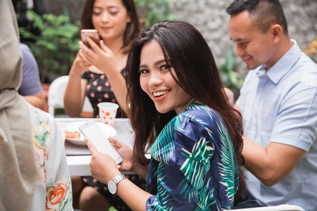 Portrait of a group of asian women friends taking a selfie with a mobile phone together.