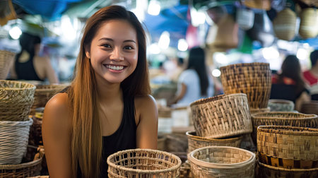 A cheerful Asian woman examining handwoven baskets at Chatuchak Market, her casual style and smile capturing the essence of travel and lifestyle.