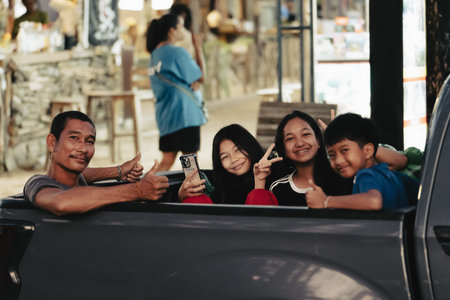 Khao Lak, Thailand, 16 11 2025: A Thai family in the back of a pickup truck is driving home. A smiling family, Dad and his children. Thailand is the land of smiles and sabai sabai,. High quality photo