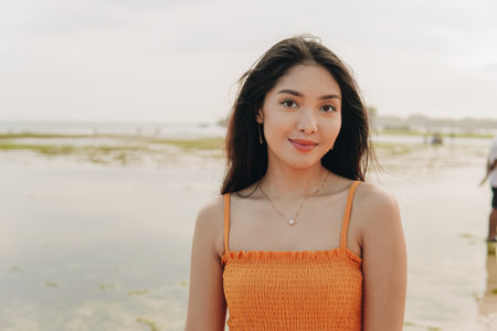 Calm young Asian woman wearing an orange dress is smiling at the camera with the ocean in the background.
