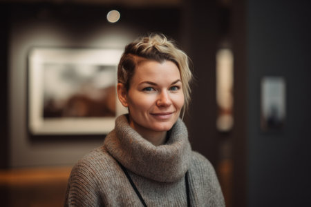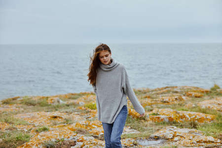 A woman in cozy sweater stands by tranquil shoreline at sunset, gazing into the distance