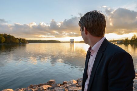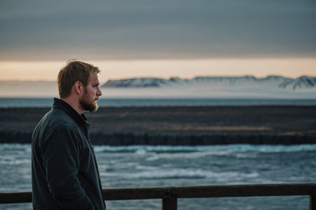 Handsome young man standing by the ocean and looking at the sunset in Iceland