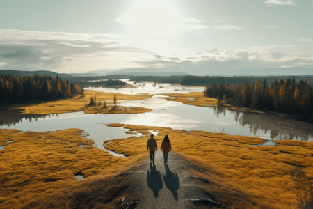 Capturing Unforgettable Moments: Aerial View of a Couple Strolling Hand-in-Hand in Sortavala, Russia