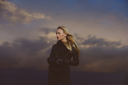 Romantic blonde girl in beige coat and black scarf stands on an empty highway staring straight into the camera against the backdrop of snow-covered meadows. High quality photo