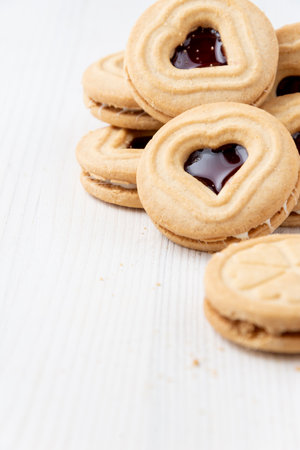 Top view of a group of heart-shaped cookies with strawberry jam, on white table, in vertical, with copy space