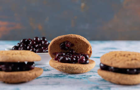 Crispy oatmeal cookies with blackcurrant berry confiture on it