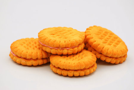 Sweet creamy filling crackers on a white-pink pastel background. ... High quality photo.