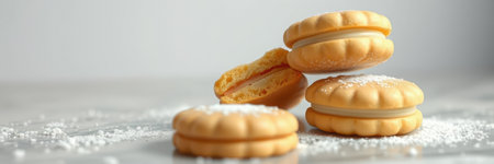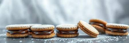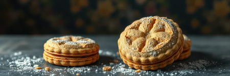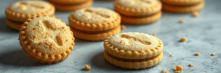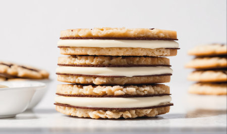 round shortbread cookies with a layer of cream on a dark background. In the background, a blurry stack of cookies. Copy space