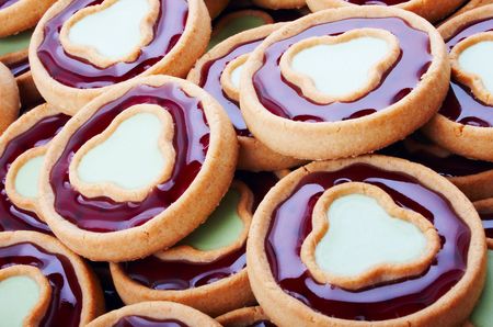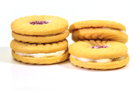 Butter cookies with strawberry jam filling on the top isolated on white background