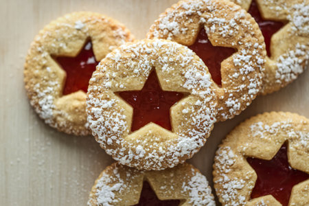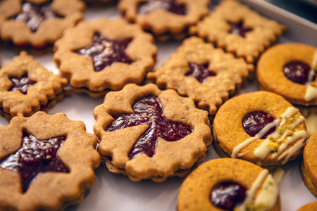 Classic various shapes of linzer Christmas cookies with strawberry jam