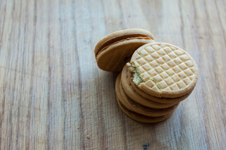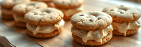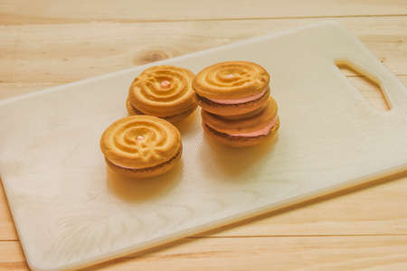 Sandwich biscuits, Cream biscuits, Cookies with cream filling on wooden table