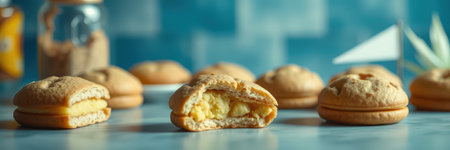 Sweet brown cookies with white cream inside on bright blue background at the bottom. Close up with copy space. Homemade and bakery concept