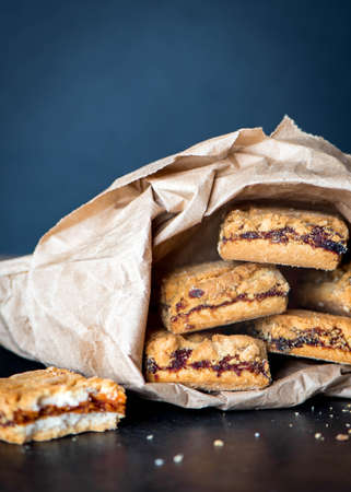 Square cookie with jam in a paper bag on dark background, with copy space.