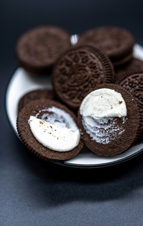 Chocolate cookies with cream filling on a plate. Selective focus.