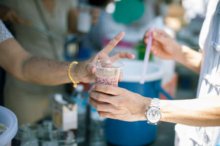 Hand begging for food from the rich's share : The beggar is waiting for food from charity aid : the concept of begging and hunger : Hunger problems of the poor have been donated food to reduce hunger