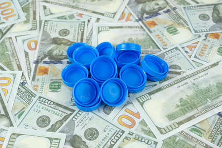 Blue plastic bottle caps on the background of hundred dollar bills. Close-up.