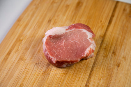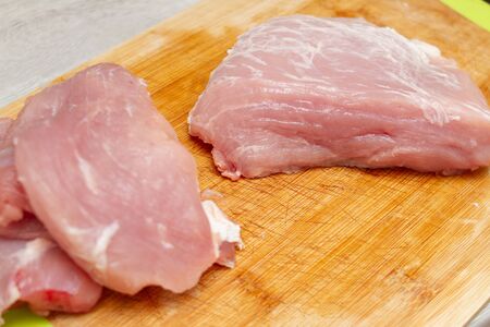 Close up of raw pork slices on wooden surface, nobody