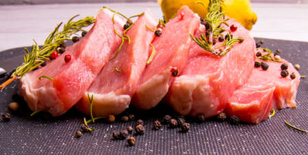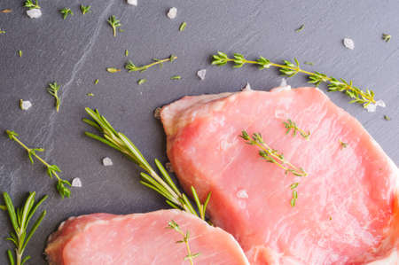 Fresh pork steaks with herbs and salt on slate board