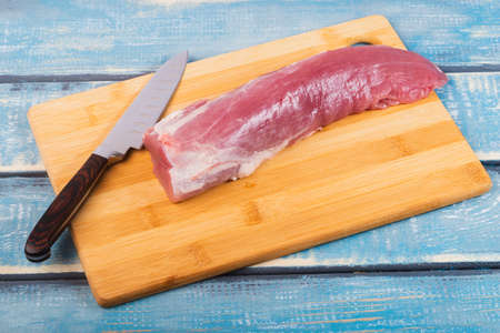 close-up of a piece of raw pork tenderloin on wooden board