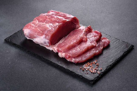 Raw fresh pork stacks do not lie on a black stone board on a gray background. Save the space. Meat preparation.