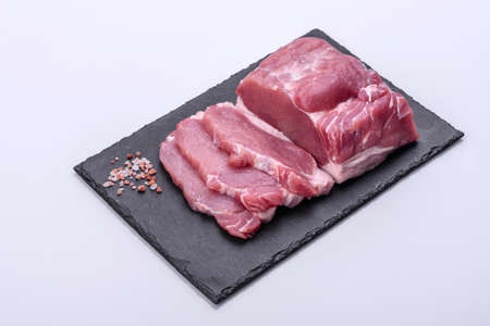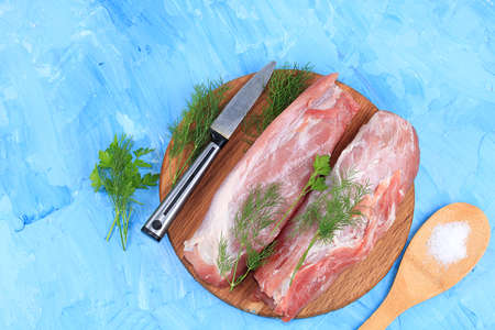 Cut fresh pork on wood board with background of salt and black pepper