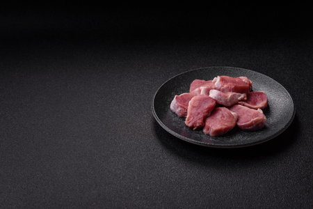 Raw meat on a cutting board. dark background. Preparation for cooking pork meat. Various spices, seasonings lie nearby.