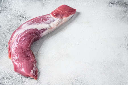 Raw pork tenderloin meat. White background. Top view. Copy space