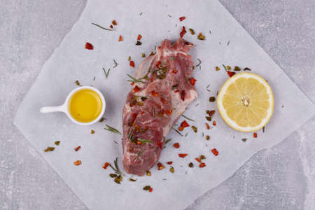Raw pork meat loin with fresh vegetables and dry spice. Animal protein healthy cooking concept. Chili and black pepper, garlic, basil, sea salt. Light stone concrete background, copy space