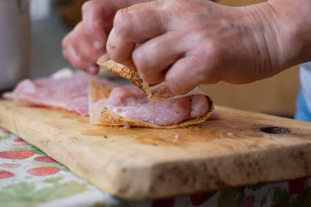 Raw pork on wood tray, food preparation procedure