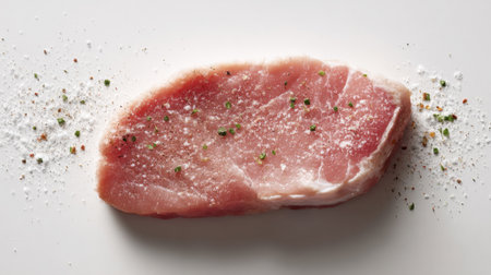 A fresh pork chop displayed on a white background, lightly sprinkled with sea salt and herbs, ideal for cooking enthusiasts and food photography.