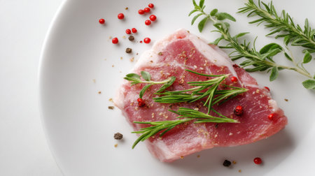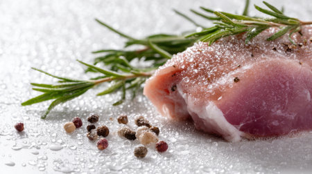 A captivating close-up of a fresh raw meat piece adorned with rosemary and a sprinkle of colorful peppercorns, with droplets of water enhancing its natural appeal.