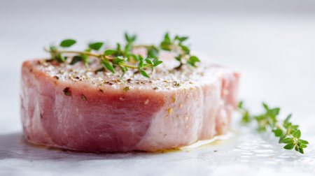 A beautifully presented raw pork chop garnished with aromatic thyme and a sprinkle of spices, showcasing the perfect ingredient for a delicious meal.