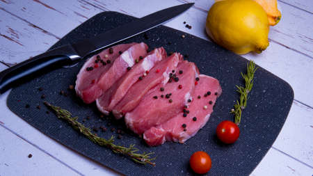 Pork. Fresh pork steaks on a black chopping board and spices, cherry tomatoes, rosemary, peppercorns, quince, knife, copy space
