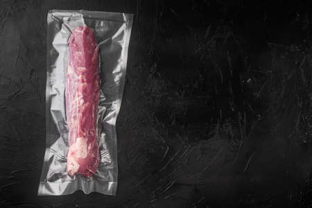 Vacuum packed raw organic pork loin meat set, on black stone background, top view flat lay, with copyspace and space for text