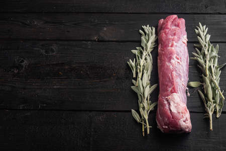 Fresh and raw meat. whole piece of Sirloin pork fillet with ingredients and herbs for grill or baking, sage, potatoe set, on black wooden table background, with copyspace and space for text