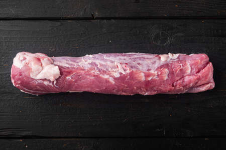 Raw organic pork loin set, on black wooden table background, top view flat lay, with copyspace and space for text