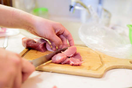 I cut pork with a knife on a wooden board