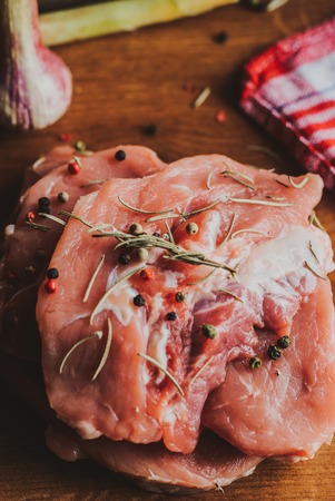 Raw pork meat / Fresh steak ready for grill with spices rosemary on wooden cutting board background - Top view