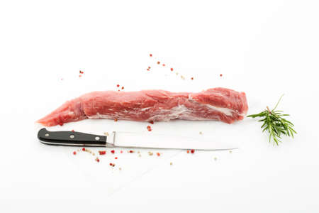 Pork loin and herbs, knife, white background