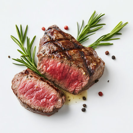 This image showcases a succulent medium rare beef steak with a perfectly seared crust. Ideal for food styling, culinary blogs, and gourmet restaurant menus.