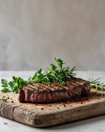 A succulent grilled steak rests on a wooden board, garnished with fresh herbs and a sprinkle of seasoning, inviting diners to savor a delicious meal in a rustic ambiance.