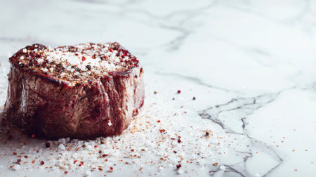 A beautifully marbled beef steak sitting on a polished marble surface, garnished with coarse salt and pepper, ideal for cooking or gourmet food presentations.