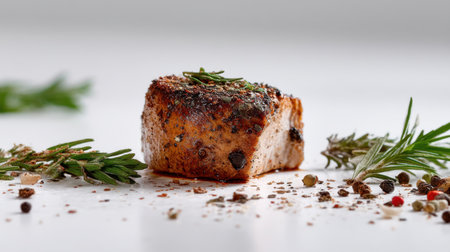 A beautifully grilled piece of meat seasoned with aromatic herbs and spices, artfully presented on a clean white surface surrounded by fresh greenery.