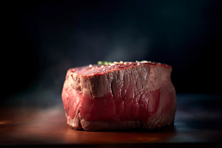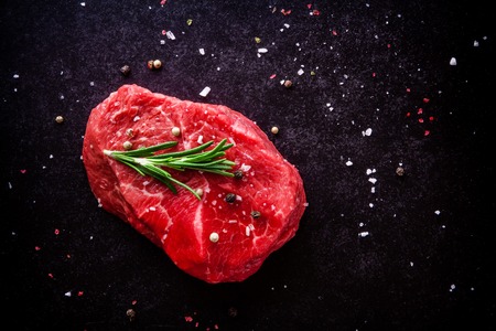 Raw beefsteak on a black cutting board. Selective focus.