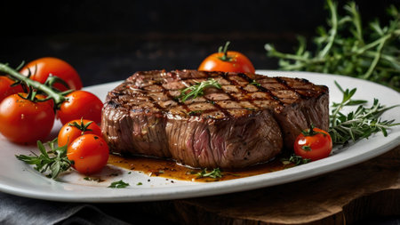 A delicious grilled steak with tomatoes and rosemary on a white plate. The steak is cooked to perfection and the tomatoes and rosemary add a touch of flavor and color.