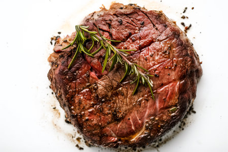 Grilled beef steak with rosemary and sea salt on white background