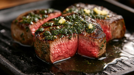 Succulent grilled steak displayed with garlic herb butter, showcasing rich textures and vibrant colors. Perfect for culinary enthusiasts and food photographers.