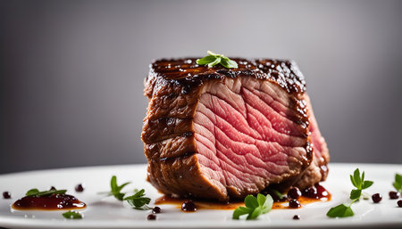 A close-up shot of a beautifully seared steak, showing its juicy, red interior and flavorful exterior. The steak is resting on a white plate, garnished with fresh herbs and a drizzle of sauce.