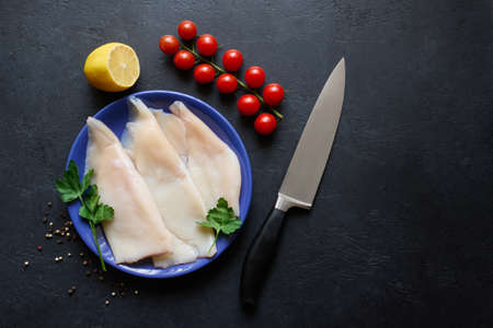 Seafood fresh squid on plate close-up and chefs knife, cooking, horizontal, flat lay with copy space